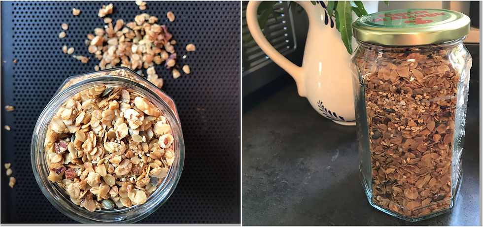 Délicieux et nutritif, le granola est un mélange de céréales, de flocons d’avoine, de fruits secs, d'huile et de miel ou de sirop d'érable ... il existe autant de combinaisons que de gourmands 😜. L'avantage par rapport au muesli est qu'il est cuit donc plus croustillant et ça...nous on adore !